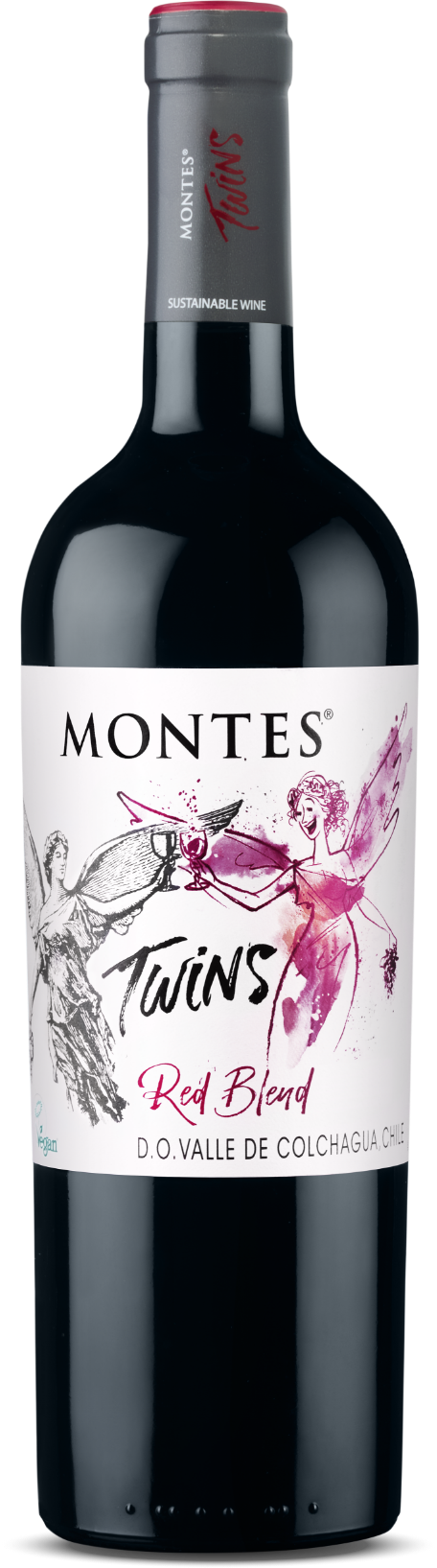 MONTES TWINS Twins Red Blend, de Viña Montes, combina cuatro variedades: la complejidad del Cabernet Sauvignon mezclado con la frescura del Tempranillo, el volumen y sedosidad en boca del Syrah y la textura e intensidad cromática del Carmenère. Una mezcla encantadora de dos terroir, Apalta y Marchigüe del Valle de Colchagua.